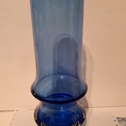 Sininen lasimaljakko, 25cm korkea, pohja 8cm yläosa 8cm