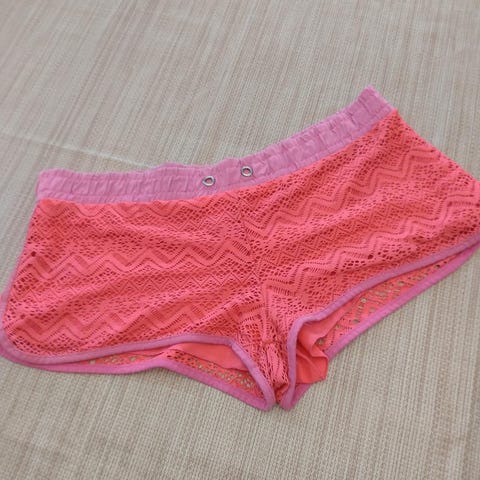 Pitsiset lyhyet shortsit. M-koko. Pituus n.30cm ja leveys (vyötärö) 34cm(1/2). Kuminauha vyötäröllä.