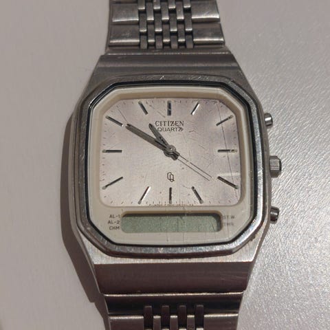 Myydään retro Citizen Quartz ana-digi miesten rannekello. Myydään ilman ranneketta ( alkuperäinen ollut ilmeisesti metalli ranneke ). Lasissa hieman ajan naarmuja. Patteri uusittu. Noutohinta 35 euroa, postitettuna lisätään kulut.