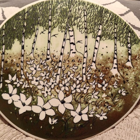 Arabia Kaj Franck seinälautanen, jossa on kukkakuviointi sinisellä ja keltaisella värillä. Valmistettu posliinista Suomessa.