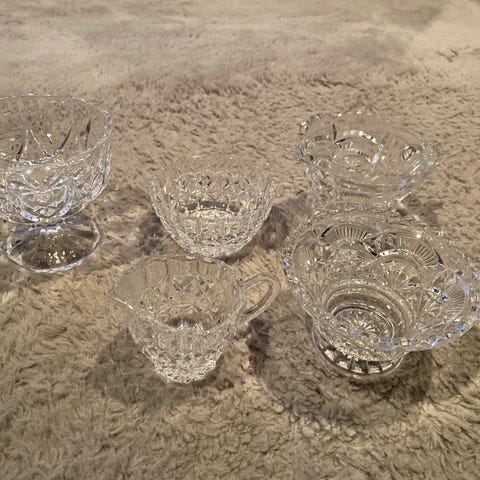 Vanha kristallimaljakko/ kirkasta lasia, jossa koristeellinen kuviointi.