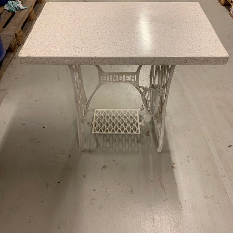 Hieno, itsetehty Singer-jalkainen pöytä. Pöytälevy mäntyä. Soveltuu esim. takkahuoneeseen, sohvapöydäksi, kukkapöydäksi yms.