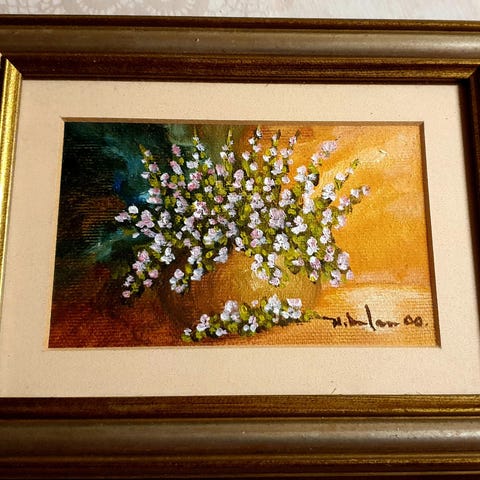 Kaunis kukkataulu 1950 luvulta. Korkeus 33,5 cm, lev. 27 cm. Hyväkuntoinen. Ensinmäisen kuvan värit on oikeat, muissa valoitus huono.