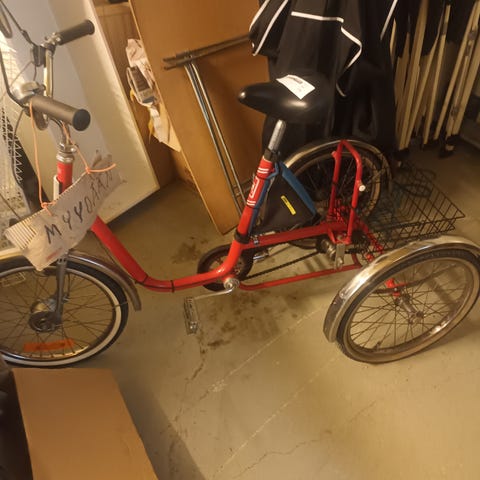 Siisti, ehjä, kolhimaton kolmipyörä, jossa kaksikko pyörät edessä. Helkama.