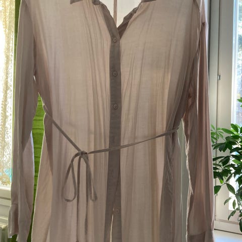 Todella reilun kokoinen paita. Menee kokoon 44 saakka.Mitat; kainalo-kainalo 59cm helmanleveys 63cm niskahelma 82cm hihanpituus 60cm. Edessä nappilista takana poimut. Vyö jossa helposti pois otettavat lenkit. Voi siis käyttää muutoinkin kuin äitiyspaitana. 100% viskoosia.