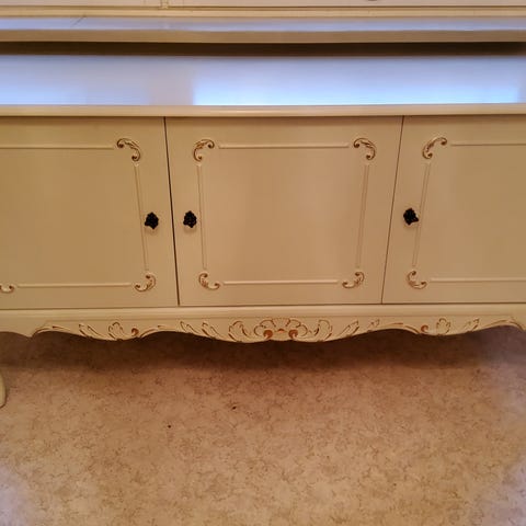 Barokkisenkki massiivipuuta upeilla koristeilla. Kaksi vetolaatikkoa ja hyllykköä joissa lukot. Lukot toimivat samalla avaimella. Pinnat patinoitunut ja joitain pieniä jälkiä löytyy. Osa listoista puuttuu.
