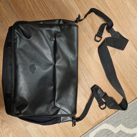 Hyväkuntoinen ja siisti Adidas-olkalaukku. Vähänkäytetty. Olkahihnan pituus saadettävissä. Edessä vetoketjullinen tasku ja sisällä kaksi sivutaskua.