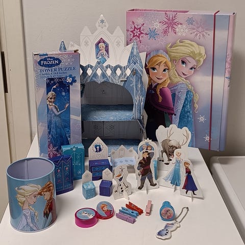 Myydään Disneyn Frozen-aiheinen setti. Settiin kuuluvat seuraavat tavarat: