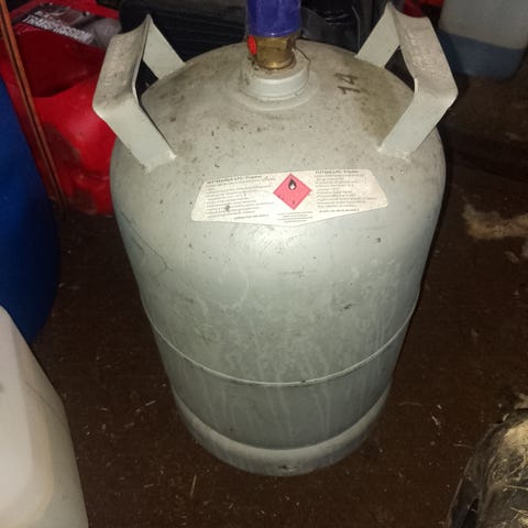 Kaksi 11kg kaasupulloa. Pullot täysiä. Kuvassa toinen pulloista. Nouto. Voin tuoda Tampereelle Lielahteen kulkujeni mukaan