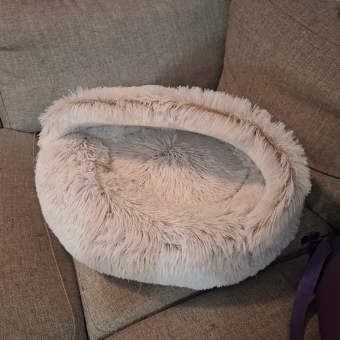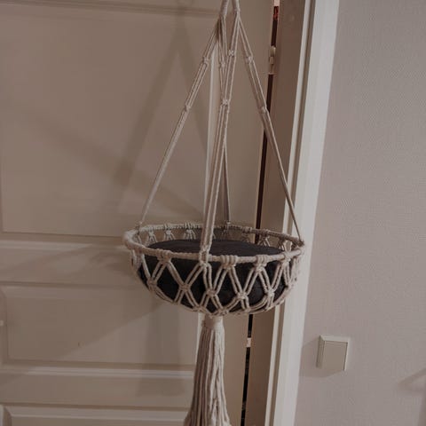Myydään käyttämätön ja siisti, käsityönä tehty makramee kissan keinu, jossa aito lampaantaljapatja. Keinussa kaksi roikkuvaa lelua kissalle. Makuualustan halkaisija 40cm.