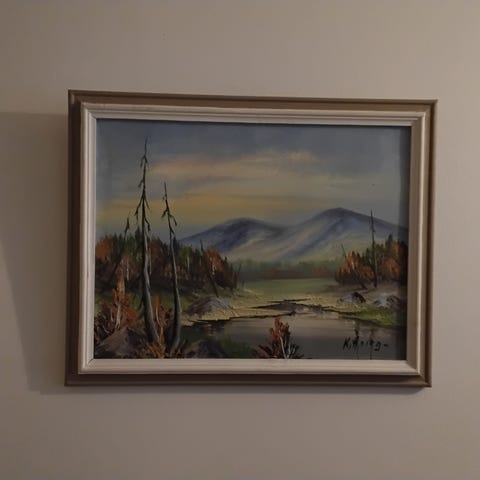 Maisema Maalaus Kehyksessä,,kehyksen koko 45x55cm, seinä kiinnitys, kehyksessä on paloja pois, maalaus on ehjä.