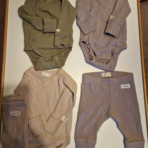 Viininpunainen röyhelöbody ja hiekanväriset housut vauvalle.
