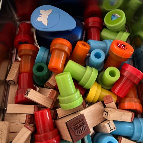 Vanha leimasin leikkeihin, 6 kpl. Muste toki kuivunut jo. Lasten lelut. Famos 542.