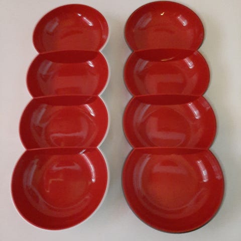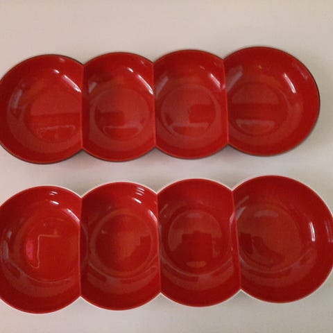 Tupperware. Allegra tarjoilukulhot 4 kpl tilavuus 2,75 dl sisältä kullanväriset ulkoa punaiset ja punaiset kannet hinta 47 eur