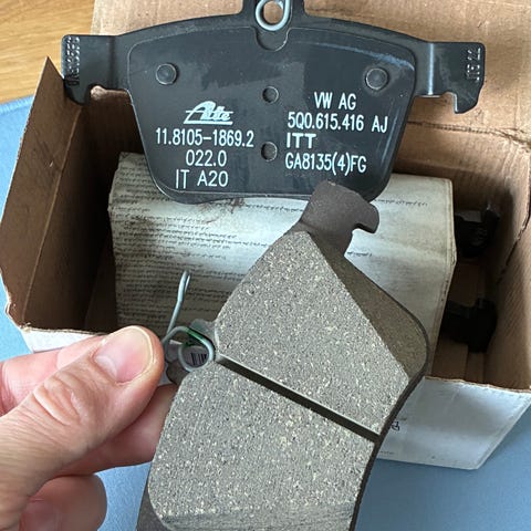 Tarpeettomaksi jääneet käyttämättömät kuvan mukaiset jarrupalat (sis. anturin), sopivuus mm. VW Golf, Touran ja Skoda Octavia malleihin ja moniin muihin, varmista vain OEM numero alla olevasta listasta