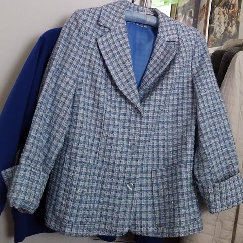 Italialainen vintage-jakku. Italian koko 48. Pellavaa. Punainen väri hiukan levinnyt kauluksessa valkoiseen väriin.