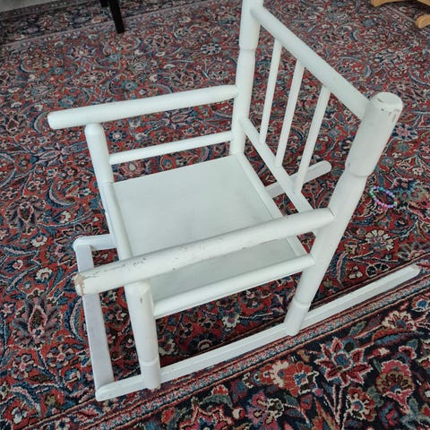 Lasten valkoinen rottinkikeinutuoli. Hyvä kunto muuten, mutta kaipaa maalia.