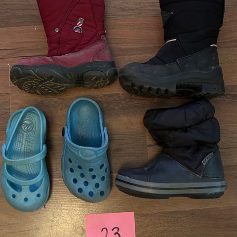 Seuraavalle kenkiä koossa 23. Yhdet talvikengät. Kaikki käytetyssä mutta ehjässä kunnossa.