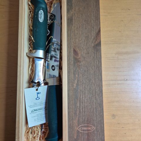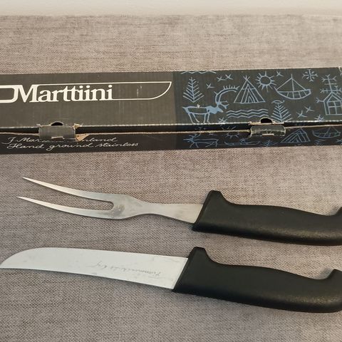 Marttiinin käyttämättömät lihaveitsi ja haarukka puurasissa. Koko pituus: 27 cm, terän pituus: 15 cm. Kahvaosa kumia. Ruostumatonta kromiterästä. Kaupan päälle puinen leikkuulaita, myös uusi. Veitsissä ei ole mitään muita kaiverruksia kuin Marttiinin omat kaiverrukset/logot.