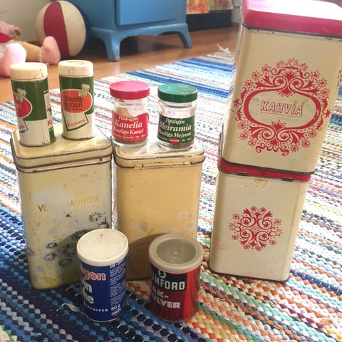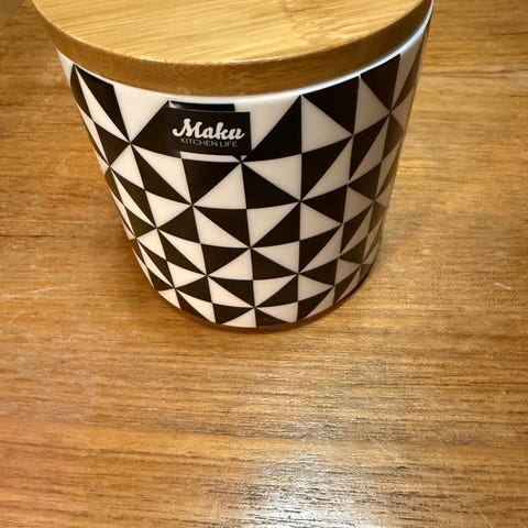 3 purkin setti. Lasittettua keramiikkaa, ns, munankuorikuvio. Isompien purkkien koko: Leveys: 12,5 cm, korkeus nupista mitattuna: 18,5 cm. Pienemmän purkin koko: Leveys: 9 cm, korkeus nupista mitattuna: 20 cm.