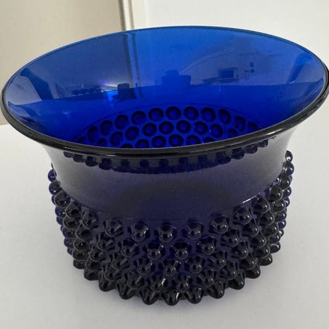 Tarjolla on upea ja tyylikäs Saara Hopean suunnittelema Näppyläkulho, jonka on valmistanut Nuutajärven lasitehdas. Tämä koboltinsininen lasikulho on erinomainen esimerkki suomalaisesta lasimuotoilusta ja sopii niin käyttöön kuin keräilyyn.