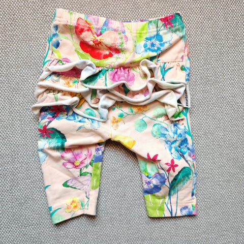 Metsolan ihanat frillalegginsit koossa 50/56. Meadow-kuosi. Kunto muuten hyvä, mutta takapuolesta korjattu pari pientä reikää (kuva 3.) Jäävät frillan alle.