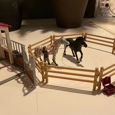 Iso paljon leikitty itsetehty aitaus, ovea ole kiinnitetty mutta saa mukaan. Kaksi karsinaa irronnut liimauksesta mutta helppo korjata kuumaliimalla. Muuton alta pois