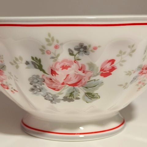 Valkoinen Greengate kulho, jossa punaisia kukkia. Tilavuus 400 ml, korkeus 7,5 cm ja halkaisija 13,5 cm. Mikron ja konepesun kestävää keramiikkaa. Uusi ja käyttämätön.