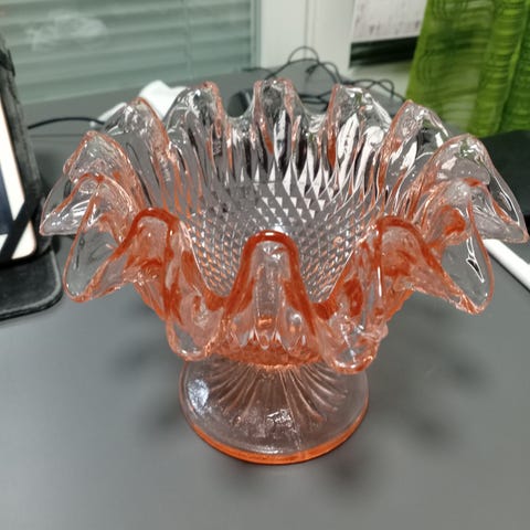 Siisti ja ehjä puristelasia. Ollut koristeena, sopii myös esim kiisselille, salaatille hslk n. 20cm k. N. 10cm