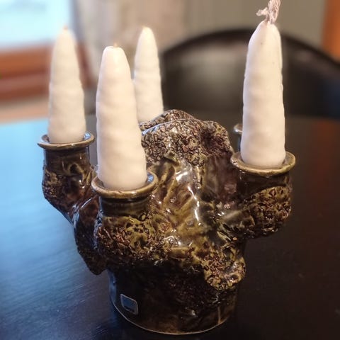 Anu Pentikin suunnittelema Kaamoskivi kynttilänjalka. Suomalaista designia 1970-luvulta. Paikat 11 kynttilälle. Hiukan sanottavaa kahdessa kynttilän laittopaikassa. Näkyy viimeisessä kuvassa. Nouto. Kulkeutuu satunnaisesti Helsingin Kamppiin j Vantaalle.