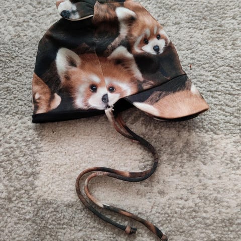 Ompelijan Suomessa tekemä Sikaihana -lippapipo. Kaksinkertaista trikoota, pehmeällä tupsulla. Aivan ihana pienelle ulkoilijalle. Täysin uudenveroinen, oli meillä käytössä vain pienen hetken.