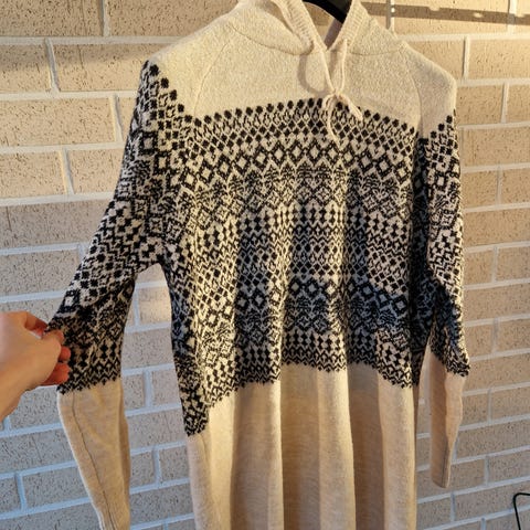 Nukkaantumista selkeästi havaittavissa. Leveähköt 3/4-hihat, poolokaulus ja neuleen helma selkäpuolelta on selkeästi pidempi kuin etupuolen helma. Kokonaispituus olkapäästä selkäpuolen helmaan on noin 94 cm. Sivuilla pitkät halkiot. Rento istuvuus M-koossa. Neulos harvaa, näkyy hieman läpi.