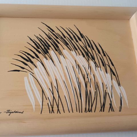 Myydään Aarikan puinen tarjotin, jonka voi laittaa vaikka seinälle tauluksi.