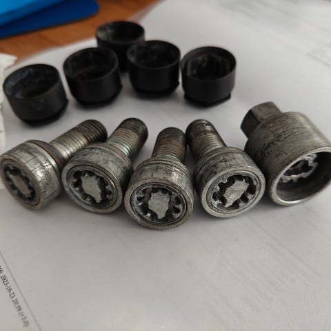Lukkopulttisarjoja. Audiin löytyy lukkopultit + kaikki muutkin pultit. Mersuun lukkopulttisarja, lähes uusi. Kaksi sarjaa BMW lukkopultteja. Suojaa kalliit vanteesi varkailta. Hinnat 10 € - 25 €.