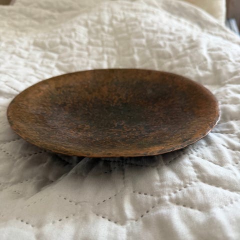 Patinoitunut vanha seinälautanen, jossa aiheena ilmeisesti roomalaisen miehen pää. Olisiko jopa joku Antiikin jumalista tai ehkä joku hallitsija. Päässä on viininköynnösseppele. Kauniita koristuksia myös reunoilla. Halkaisija 24,5 cm, korkeus n 3 cm. Lautaseen on valitettavasti tehty kaksi pientä reikää ilmeisesti ripustamista varten. Postitus tai nouto.