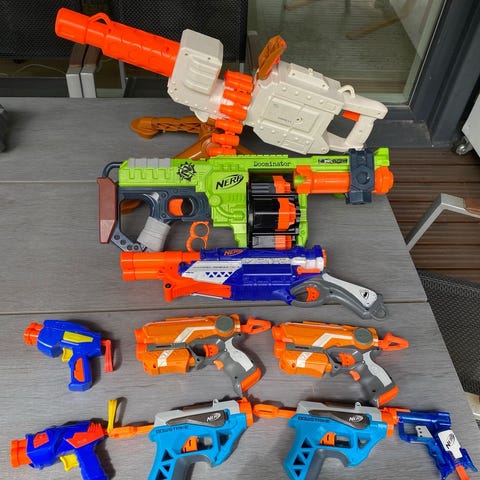 Nerf aseita, toimivia. Jotain panoksia mukaan