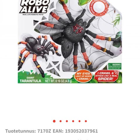 Sähäkästi itsekseen eteenpäin liikkuva punamusta hämähäkki. Pystyy liikkumaan tasaisella alustalla. Pituus n. 13 cm. Paristot mukana.