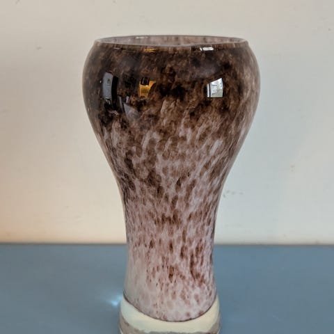 Myydään Inkeri Toikan suunnittelema lasinen Pastoraali-maljakko. Tämä on isompaa kokoa eli korkeus 22cm ja suun halkaisija 10cm. Valmistettu Nuutajärvellä 80-luvulla. Maljakoissa on aina omanlainen värjäys, joten jokainen Pastoraali on hieman erilainen. Pohjassa kaiverrus päiväyksellä, mutta jää piiloon käytössä.