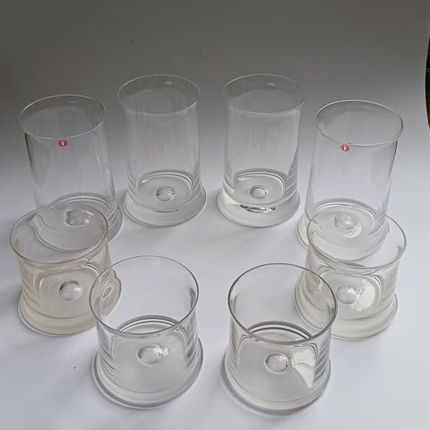 Tapio Wirkkalan Kapteeni -sarjan karahvi (H 18 cm ilman korkkia, pohja Ø 14 cm), 6 olutlasia (H 11,5 cm, Ø 7 cm), 4 vesilasia (H 7 cm, Ø 7 cm) ja 8 snapsilasia (H 5 cm, Ø 5 cm). 1960-luku. Iittala. Hinta 620€.