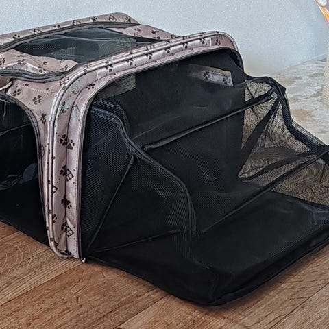 Kantolaukku Basic Traveller sopii kissojen ja pienien koirien kuljettamiseen. Kevyt kantokassi sopii max. 5 kg lemmikeille. Kantokassissa on irrotettava olkahihna sekä lyhyemmät kahvat, jotka saa liitettyä yhteen tukevaksi kahvaksi. Kantolaukussa on vetoketjulla avattavat ovet päädyssä, sivulla ja päällä. Verkkokangas joka sivulla ja päällä mahdollistaa hyvän ilmanvaihdon ja lemmikin ympäristön katselun. Väri sininen, koko 46 x 28 x 29 cm. Ostettu Peten koiratarvikkeesta.