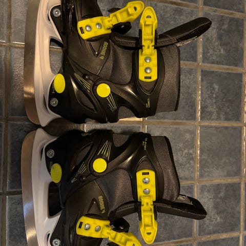 Hyvin vähäisellä käytöllä olleet kenkiin kiinnitettävät lasten luistimet. Koko säädettävä, pohja väittää 24 - 31 ja säätövaraa on paljon isommallekin luisteluun opettelevalle.
