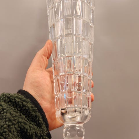 Aimo Okkolin Riihimäen Lasille suunnittelema massiivinen kristalimalja. Reunus on hopeaa. Ei riksuja tai säröjä. Hyvin pieniä siirtelyn jälkiä pohjassa