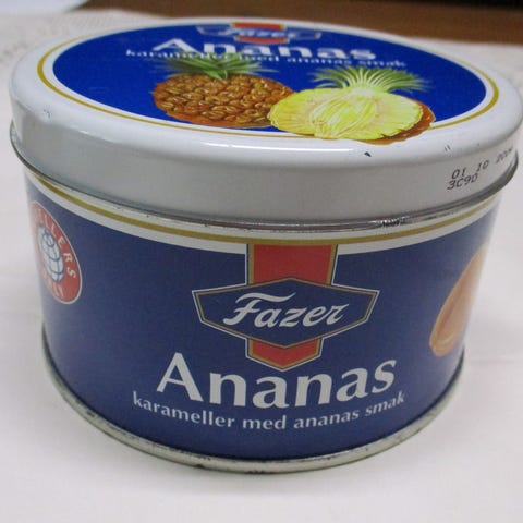 Vanha 70-luvun Ananas karamellipurkki. Halkaisija 10 cm. Valmistaja Fazer. Postitus onnistuu.