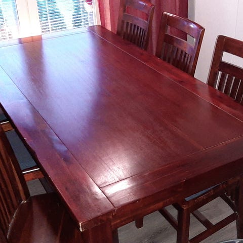 Pohjanmaan kalusteen Aurora 8 hengen ruokapöytä. Massiivipuinen, tukeva pöytä, Väriltään pähkinä. Siistikuntoinen.