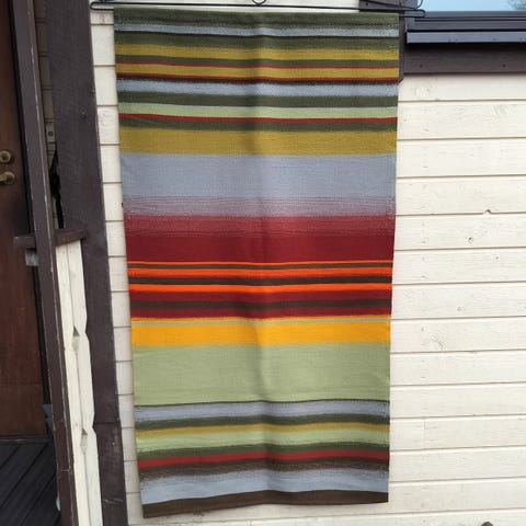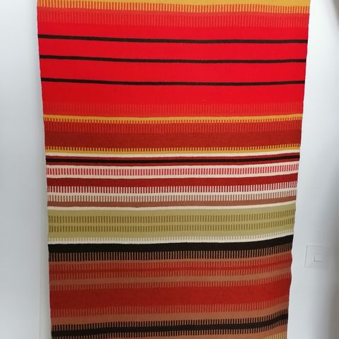 Kuvan vanha kangaspuilla kudottu siisti seinävaate, pituus 180 cm, korkeus 71 cm + hapsut noin 16 cm, valmistettu villaisesta raanulangasta. Siistiä käsityötä. Tämä sopii myös sohvan päälliseksi. Voin lähettää.