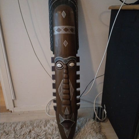 Tummanruskea, puinen, seinälle ripustettava naamio.