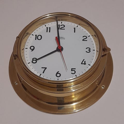 Laivakello, messinkiä ja jalopuutausta.