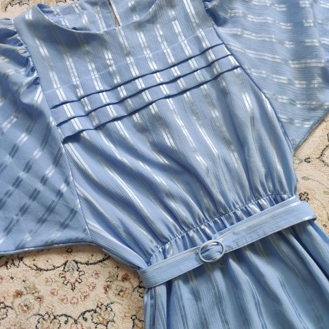 Vanha 90- luvun 2-osainen juhla-asu. Jakku/paita koriste napeilla. Hameessa koriste leikkaus ja solki, takana vetoketju. Väri murrettu keltainen ja sininenpetrooli. Koko on vähän arvailua?? Ehkä 38??? Merkistä ei tietoa. Ostettu 1991 eli aito ysäri😊