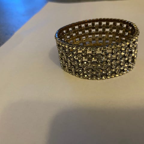 Kaunis kullanvärinen rannerengas, käärmeennahkakuvioinen. Sisäpuolen halkaisija 7 cm. Renkaan leveys 2,5 cm. Ilmeisesti muovinen rengas päällystetty kullanvärisellä kankaalla. Ehjä ja siisti. Postitus tai nouto.