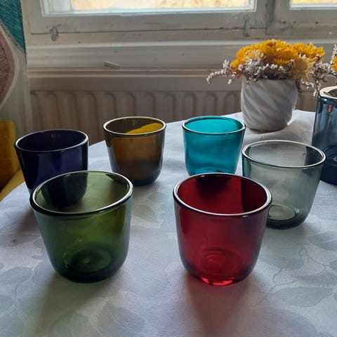 Kaj Franckin 1153 snapsilasit. Nuutajärven lasi 1954. Korkeus 6cm, halk. 3,5cm.